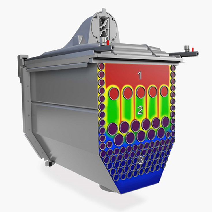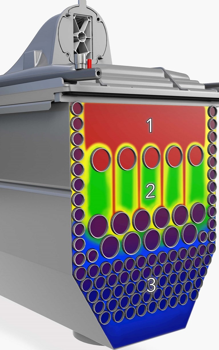 Door specifieke zones met tegenstrijdige eisen te beheren, kan een maximale energieopbrengst worden behaald met extreem lage emissies. In zone 1 stijgen de temperaturen tot boven de 1.000 °C, de vorming van NOx is hier nauwelijks mogelijk. Dankzij een snelle doorstroming en snelle temperatuurverlaging worden de rookgastemperaturen boven de 600 °C gehouden, wat een optimale CO-vorming mogelijk maakt. De condensatie en de overdracht van de resterende rookgasenergie vindt plaats bij ca. 56 °C in zone 3.