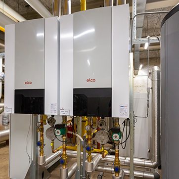 De gekozen opstelling – gescheiden CV en tapwater- vormt één duurzame verwarmingsinstallatie die rekening houdt met de individuele warmtebehoefte van de appartementen en gemeenschappelijke ruimten.